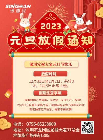 深國安2023年春節放假安排如下:放假時間:2023年1月18日-2023年1月28日,共放假11天(2023年1月29日初八正常上班)(放假期間正常接單,統一年后安排生產與發貨!)正值春節來臨...