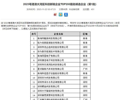 重磅消息!熱烈祝賀深國安入選2023粵港澳大灣區科創新銳企業TOP200第一批提名候選企業,排在第86位,一同入圍的還有華為、優必選、魅族等企業。